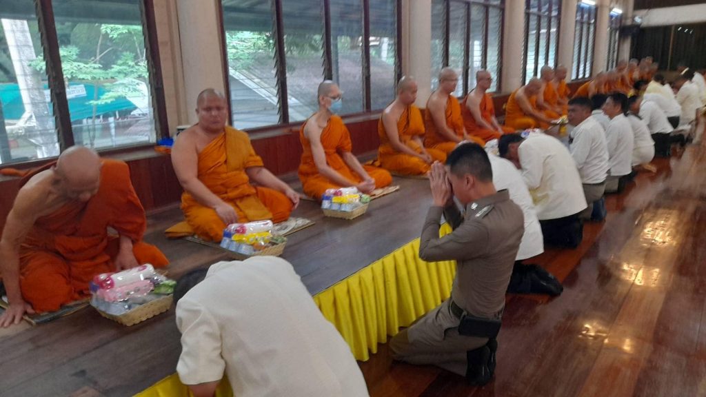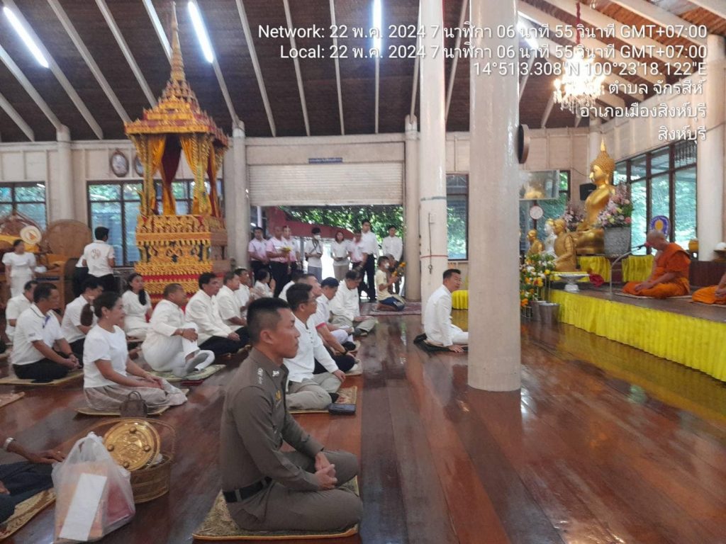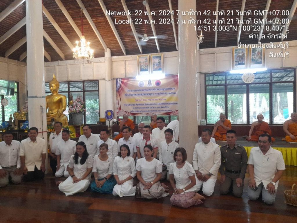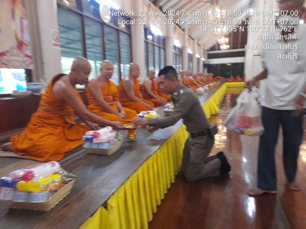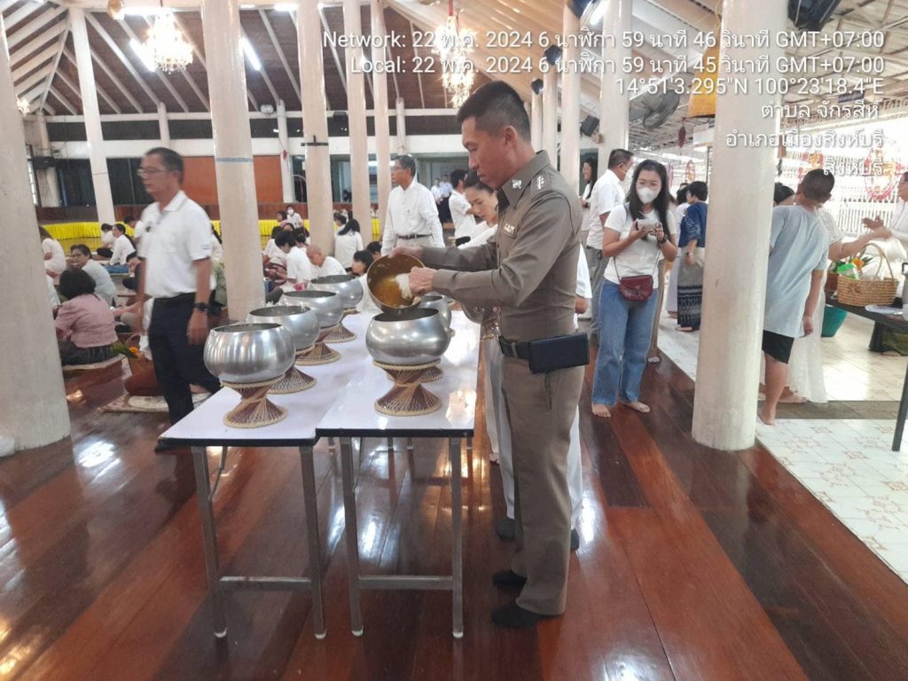 วันที่ 22 พฤษภาคม 2567 เวลา 07.19 น. พ.ต.อ.ปฏิกรณ์ หาญหัตถกิจ ผกก.สภ.เมืองสิงห์บุรี เป็นตัวแทนข้าราชการตำรวจ สภ.เมืองสิงห์บุรี ร่วมพิธีทำบุญตักบาตรเนื่องในวันวิสาขบูชา โดยมี พระครูสิริปริยติคุณ เจ้าคณะตำบลต้นโพธิ์ผู้ช่วยเจ้าอาวาสวัดพระนอนจักรสีห์วรวิหารเป็นประธานฝ่ายสงฆ์ นายสุเมธ ธีรนิติ ผู้ว่าราชการจังหวัดสิงห์บุรี เป็นประธานฝ่ายฆราวาส กิจกรรมส่งเสริมพระพุทธศาสนาเนื่องในเทศกาลวันวิสาขบูชา