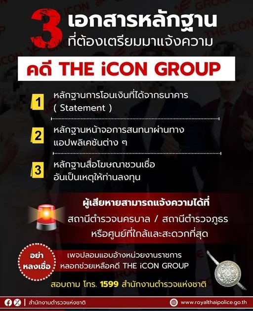 คดี “ดิไอคอนกรุ๊ป” แจ้งความได้ที่ สน./สภ. ทุกแห่ง 19 ตุลาคม 2567 โดย adminMuangsing / ข่าวประชาสัมพันธ์ จำนวนคนดู 4 คดี “ดิไอคอนกรุ๊ป” แจ้งความได้ที่ สน. / สภ. ทุกแห่ง หรือศูนย์รับแจ้งความที่ใกล้ และสะดวกที่สุด 3 เอกสารหลักฐานที่ต้องเตรียมเมื่อท่านไปแจ้งความร้องทุกข์คดี THE iCON GROUP หลักฐานการโอนเงินที่ได้จากธนาคาร (Statement) หลักฐานหน้าจอการสนทนาผ่านทางแอปพลิเคชันต่าง ๆ หลักฐานสื่อโฆษณาชวนเชื่อ อันเป็นเหตุให้ท่านลงทุนอย่าหลงเชื่อเพจปลอมแอบอ้างหน่วยงานราชการ หลอกช่วยเหลือคดี THE iCON GROUPท่านสามารถโทรสอบถามได้ที่ : สายด่วนสำนักงานตำรวจแห่งชาติ โทร.1599#ดิไอคอนกรุ๊ป#Theicongroup#สำนักงานตำรวจแห่งชาติ#Royalthaipolice