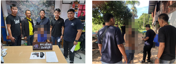 วันที่ 9 เดือน ธันวาคม พ.ศ. 2567 เวลา 16.30 น. ภายใต้การอำนวยการสั่งการของ พ.ต.อ.ปฏิกรณ์ หาญหัตถกิจ ผกก.สภ.เมืองสิงห์บุรี,พ.ต.ท.นพดล ธรรมเนียม รอง ผกก.สส.สภ.เมืองสิงห์บุรี ได้สั่งการให้เจ้าพนักงานตำรวจนำโดย พ.ต.ท.ประธาน พุ่มอ่ำ สว.สส.สภ.เมืองสิงห์บุรี พร้อมชุดสืบสวน สภ.เมืองสิงห์บุรี ร่วมกันจับกุมตัวผู้ต้องหา เป็นชาย อายุ 51 ปี พร้อมด้วยของกลาง 1. อาวุธปืนลูกซองสั้นไทยประดิษฐ์แบบหักลำกล้องสีดำขนาด .38 จำนวน 1 กระบอก 2. เครื่องกระสุนปืนขนาด .38 จำนวน 1 ลูก 3. ซองอาวุธปืนพกในสีดำ จำนวน 1 ซอง โดยกล่าวหาว่า 1. มีอาวุธปืนและเครื่องกระสุนปืนไว้ในความครอบครองโดยไม่ได้รับอนุญาต 2. เสพยาเสพติดให้โทษประเภทที่ 1 (เมทแอมเฟตามีน) โดยผิดกฎหมาย
