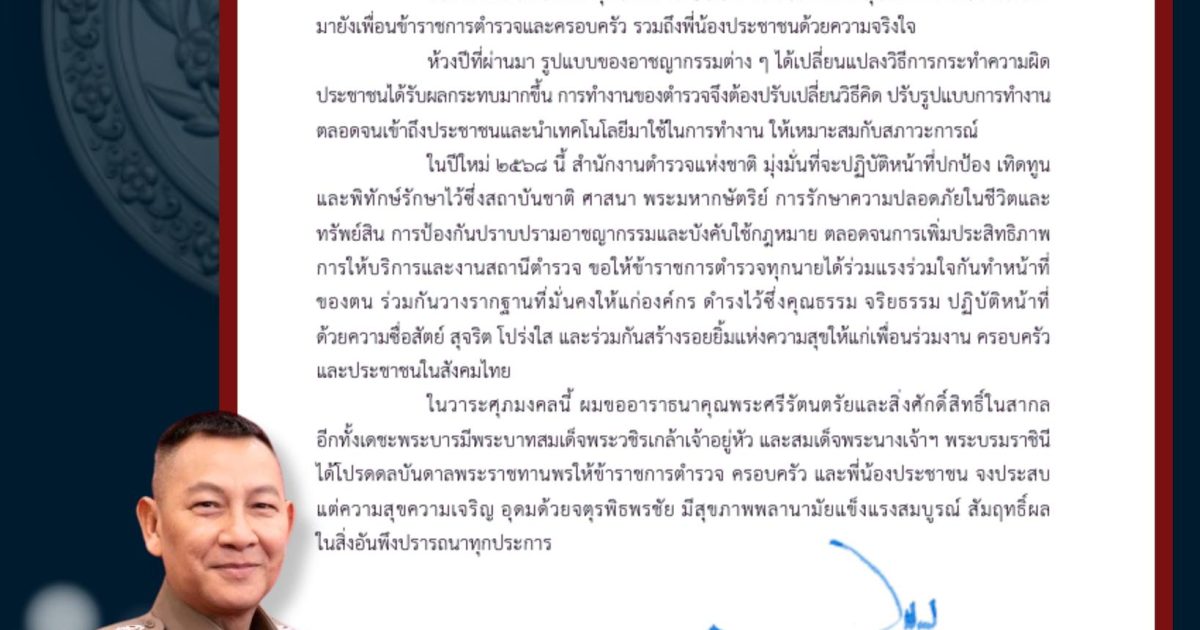 ผบ.ตร. ส่งสารอวยพรปีใหม่ 2568 31 ธันวาคม 2567 โดย adminMuangsing / ข่าวประชาสัมพันธ์ จำนวนคนดู 5 ผบ.ตร. ส่งสารอวยพรปีใหม่ 2568ส่งความปรารถนาดีถึงข้าราชการตำรวจและพี่น้องประชาชน พล.ต.อ.กิตติ์รัฐ พันธุ์เพ็ชร์ ผู้บัญชาการตำรวจแห่งชาติ ส่งสารอวยพรข้าราชการตำรวจและครอบครัว รวมถึงพี่น้องประชาชน เนื่องในโอกาสวันขึ้นปีใหม่ 1 มกราคม 2568 ระบุว่า “ในวาระดิถีขึ้นปีใหม่ พุทธศักราช 2568 ผมขอส่งความสุขและความปรารถนาดีมายังเพื่อนข้าราชการตำรวจและครอบครัว รวมถึงพี่น้องประชาชนด้วยความจริงใจ ห้วงปีที่ผ่านมา รูปแบบของอาชญากรรมต่าง ๆ ได้เปลี่ยนแปลงวิธีการกระทำความผิด ประชาชนได้รับผลกระทบมากขึ้น การทำงานของตำรวจจึงต้องปรับเปลี่ยนวิธีคิด ปรับรูปแบบการทำงาน ตลอดจนเข้าถึงประชาชนและนำเทคโนโลยีมาใช้ในการทำงาน ให้เหมาะสมกับสภาวการณ์ ในปีใหม่ 2568 นี้ สำนักงานตำรวจแห่งชาติมุ่งมั่นที่จะปฏิบัติหน้าที่ปกป้อง เทิดทูนและพิทักษ์รักษาไว้ซึ่งสถาบันชาติ ศาสนา พระมหากษัตริย์ การรักษาความปลอดภัยในชีวิตและทรัพย์สิน การป้องกัน ปราบปรามอาชญากรรมและบังคับใช้กฎหมาย ตลอดจนการเพิ่มประสิทธิภาพการให้บริการและงานสถานีตำรวจ ขอให้ข้าราชการตำรวจทุกนายได้ร่วมแรงร่วมใจกันทำหน้าที่ของตน ร่วมกันวางรากฐานที่มั่นคงให้แก่องค์กร ดำรงไว้ซึ่งคุณธรรม จริยธรรม ปฏิบัติหน้าที่ด้วยความซื่อสัตย์ สุจริต โปร่งใส และร่วมกันสร้างรอยยิ้มแห่งความสุขให้แก่เพื่อนร่วมงาน ครอบครัว และประชาชนในสังคมไทย ในวาระศุภมงคลนี้ ผมขออาราธนาคุณพระศรีรัตนตรัยและสิ่งศักดิ์สิทธิ์ในสากล อีกทั้งเดชะพระบารมีพระบาทสมเด็จพระวชิรเกล้าเจ้าอยู่หัว และสมเด็จพระนางเจ้า ฯ พระบรมราชินี ได้โปรดดลบันดาลพระราชทานพรให้ข้าราชการตำรวจ ครอบครัว และพี่น้องประชาชน จงประสบแต่ความสุขความเจริญ อุดมด้วยจตุรพิธพรชัย มีสุขภาพพลานามัยแข็งแรงสมบูรณ์ สัมฤทธิ์ผลในสิ่งอันพึงปรารถนาทุกประการ” #ปีใหม่2568#พรปีใหม่#สำนักงานตำรวจแห่งชาติ#Royalthaipolice