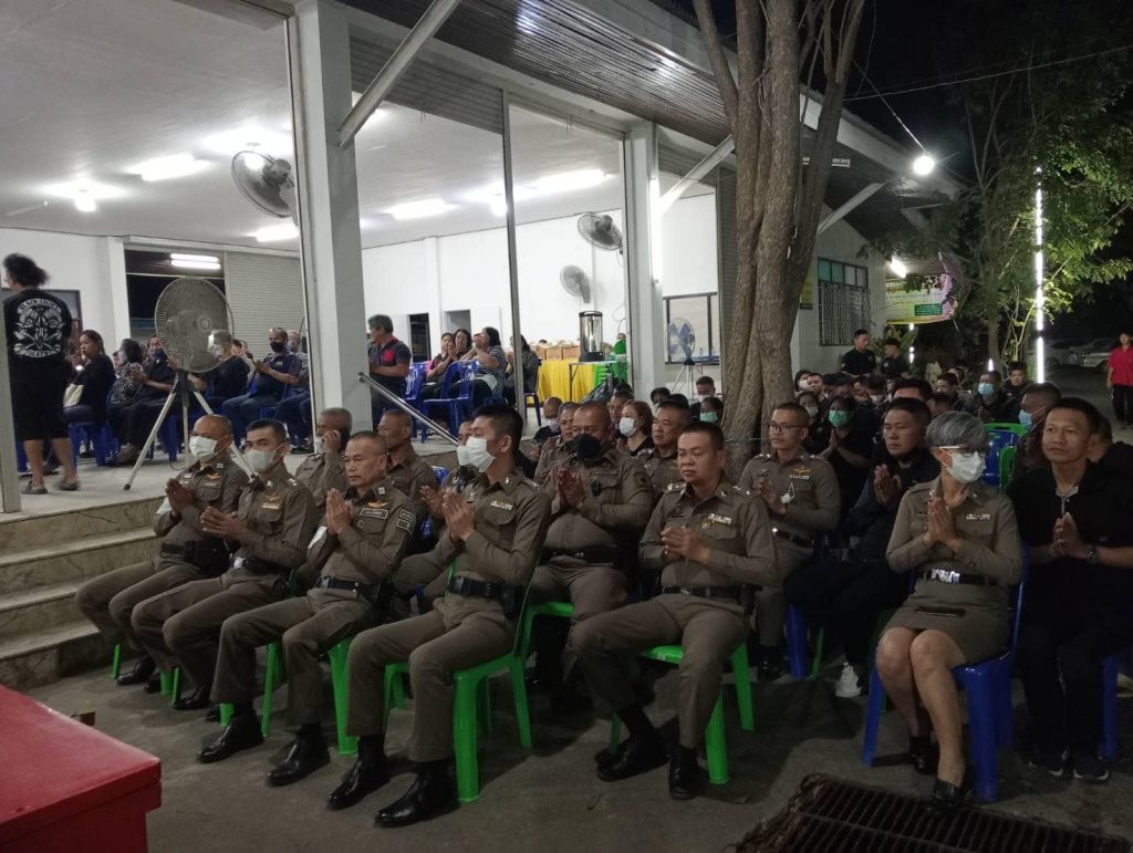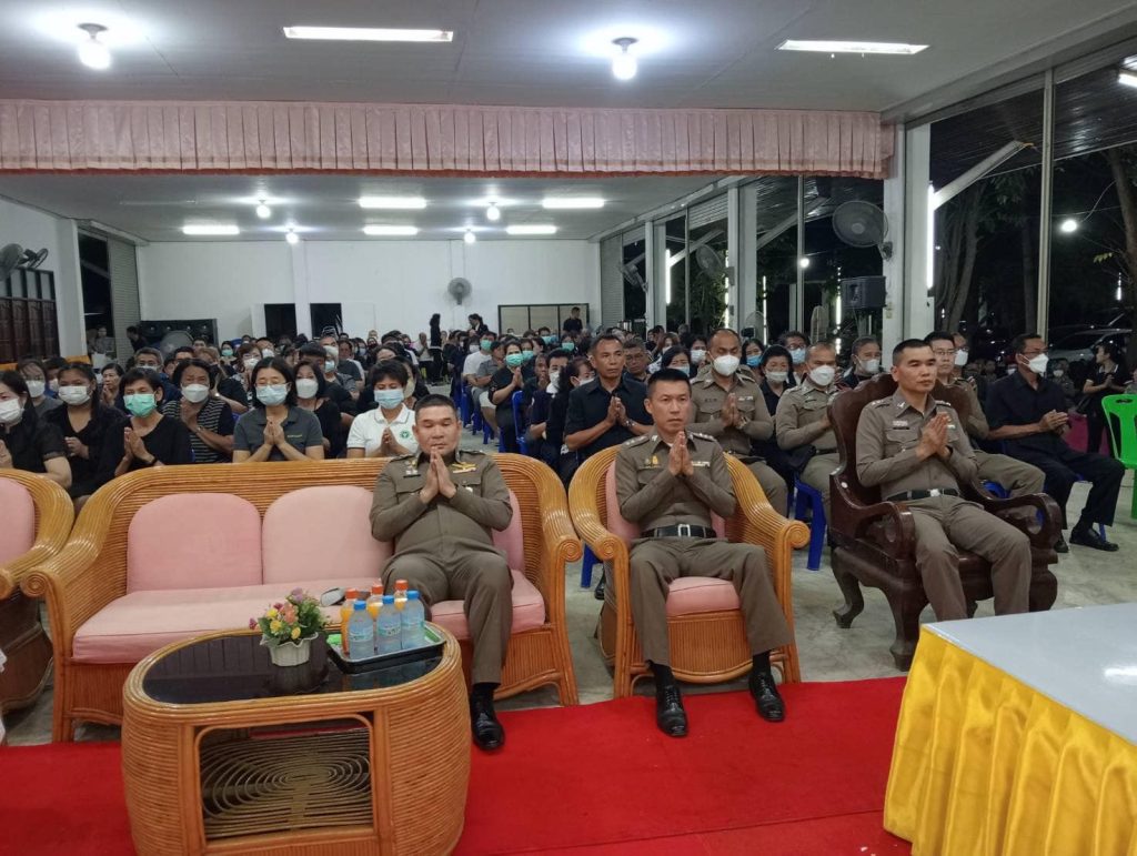 วันที่ 24 มกราคม 2567 เวลา 19.30 น. พ.ต.อ.ปฏิกรณ์ หาญหัตถกิจ ผกก.สภ.เมืองสิงห์บุรี กต.ตร. และ ผู้แทน กต.ตร.สภ.เมืองสิงห์บุรี พร้อมข้าราชการตำรวจ สภ.เมืองสิงห์บุรี ร่วมพิธีฟังสวดพระอภิธรรมศพ ของ ร.ต.ต.สาโรช แจ้งอารมณ์ รอง สว.(ป.) สภ.เมืองสิงห์บุรี ณ วัดโพธิ์เงิน อ.เมือง จ.สิงห์บุรี