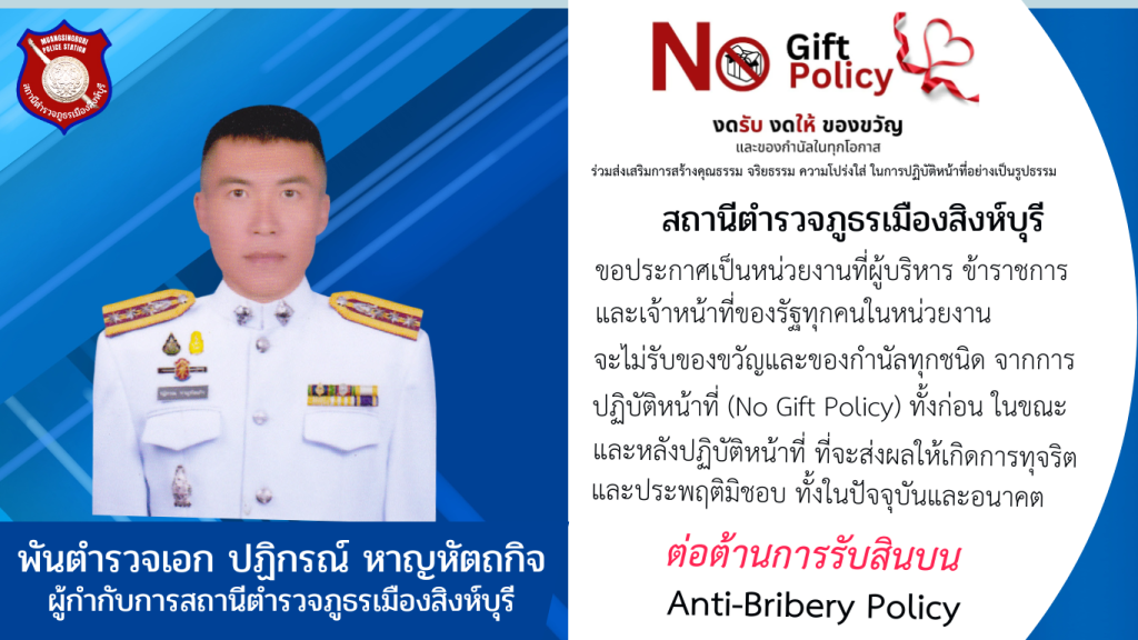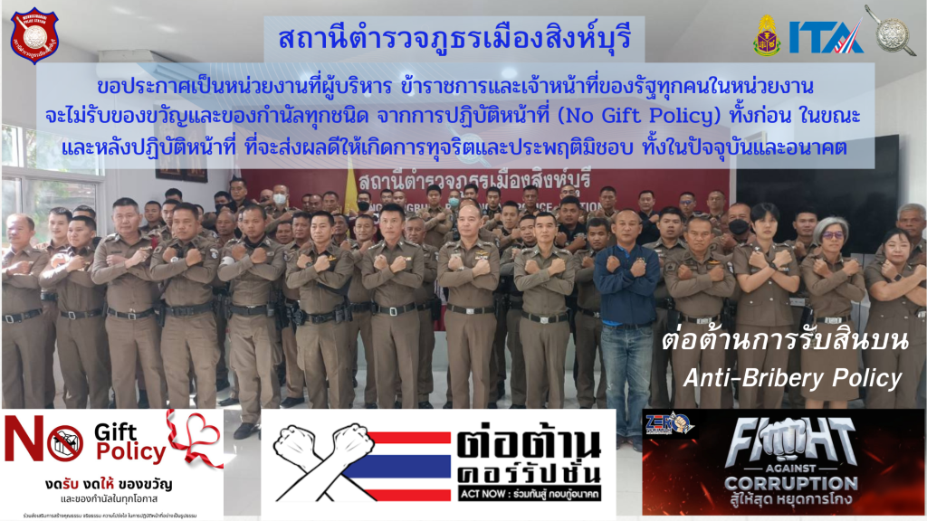 วันที่ 26 กุมภาพันธ์ 2568 เวลา 11.00 น. พ.ต.อ.ปฏิกรณ์ หาญหัตถกิจ ผกก.สภ.เมืองสิงห์บุรี ประชุมมอบนโยบายการบริหารราชการ ชี้แจงและวางแนวทางขับเคลื่อนการดำเนินงานตามโครงการประเมินคุณธรรมและความโปร่งใสในการดำเนินงานของหน่วยงานภาครัฐ (Integrity & Transparency Assessment : ITA) และรับฟังปัญหา อุปสรรคในด้านต่างๆ ของข้าราชการตำรวจจากทุกสายงาน ณ ห้องประชุมร่มโพธิ์ สภ.เมืองสิงห์บุรี พร้อมนำข้าราชการตำรวจประกาศเป็นหน่วยงานที่ผู้บริหาร ข้าราชการและเจ้าหน้าที่ของรัฐทุกคนในหน่วยงาน จะไม่รับของขวัญและของกำนัลทุกชนิด จากการปฏิบัติหน้าที่ (No Gift Policy) ทั้งก่อน ในขณะ และหลังปฏิบัติหน้าที่ ที่จะส่งผลให้เกิดการทุจริตและประพฤติมิชอบ ทั้งในปัจจุบันและอนาคต และการต่อต้านการรับสินบน (Anti-Bribery Policy) ทุกรูปแบบ