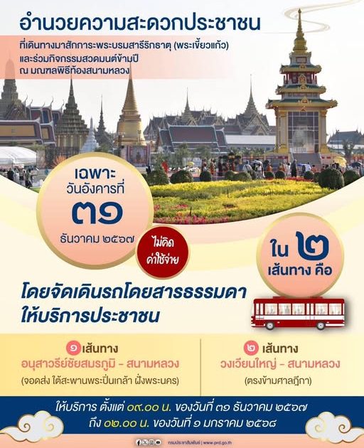 อำนวยความสะดวกประชาชนที่เดินทางมาสักการะพระบรมสารีริกธาตุ (พระเขี้ยวแก้ว) 30 ธันวาคม 2567 โดย adminMuangsing / ข่าวประชาสัมพันธ์ จำนวนคนดู 3 อำนวยความสะดวกประชาชนที่เดินทางมาสักการะพระบรมสารีริกธาตุ (พระเขี้ยวแก้ว) และร่วมกิจกรรมสวดมนต์ข้ามปี ณ มณฑลพิธีท้องสนามหลวง เฉพาะ วันอังคารที่ ๓๑ ธันวาคม ๒๕๖๗ โดยจัดเดินรถโดยสารธรรมดาให้บริการประชาชน ไม่คิดค่าใช้จ่าย ใน ๒ เส้นทาง คือ· เส้นทางอนุสาวรีย์ชัยสมรภูมิ – สนามหลวง (จอดส่ง ใต้สะพานพระปิ่นเกล้า ฝั่งพระนคร)· เส้นทางวงเวียนใหญ่ – สนามหลวง (ตรงข้ามศาลฎีกา)ให้บริการ ตั้งแต่ ๐๙.๐๐ น. ของวันที่ ๓๑ ธันวาคม ๒๕๖๗ ถึง ๐๒.๐๐ น. ของวันที่ ๑ มกราคม ๒๕๖๘ #พระราชพิธีมหามงคลเฉลิมพระชนมพรรษาพระบาทสมเด็จพระเจ้าอยู่หัว๖รอบ#พระบรมสารีริกธาตุพระเขี้ยวแก้ว#อำนวยความสะดวกประชาชน#มณฑลพิธีท้องสนามหลวง#สวดมนต์ข้ามปีhttps://www.facebook.com/share/p/6GaTneeYGQEurqa2/https://www.facebook.com/share/p/BvBmjDsGjvR1YMFf/https://www.facebook.com/share/p/YmacvSZA7q7C